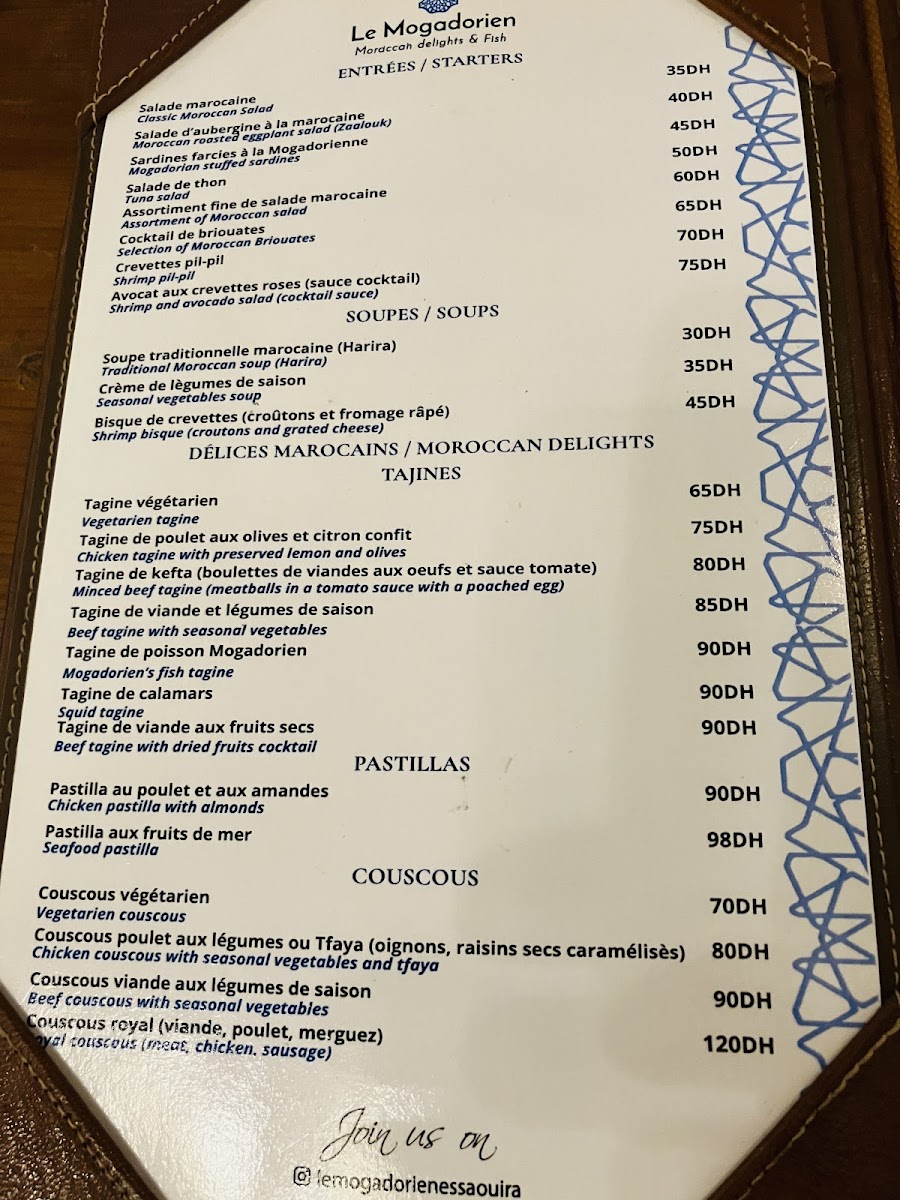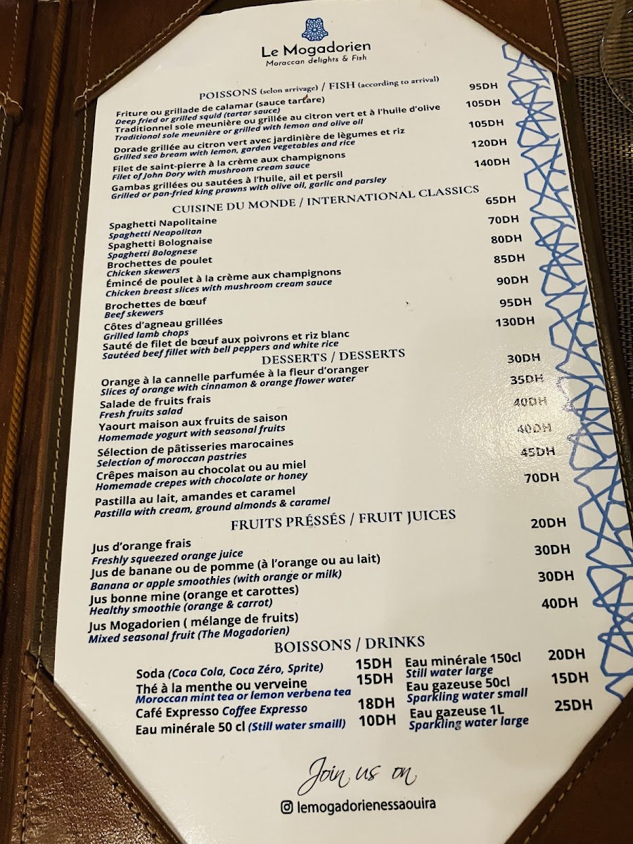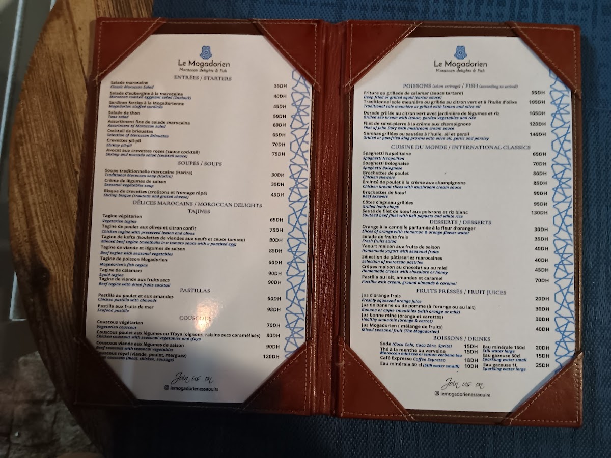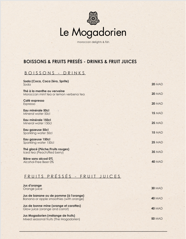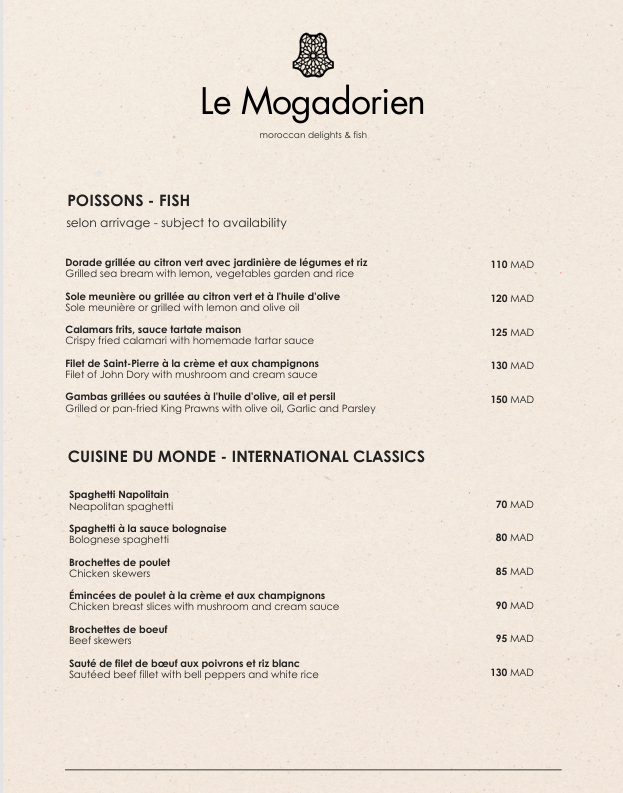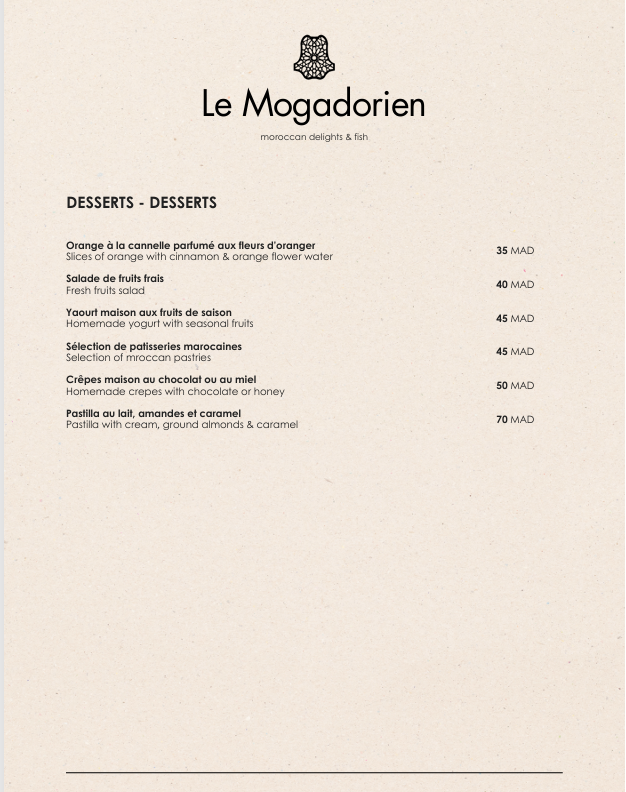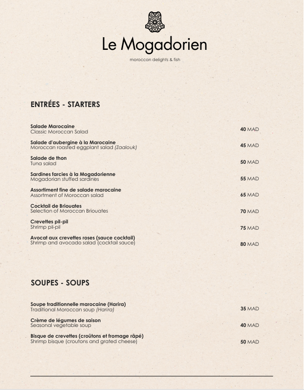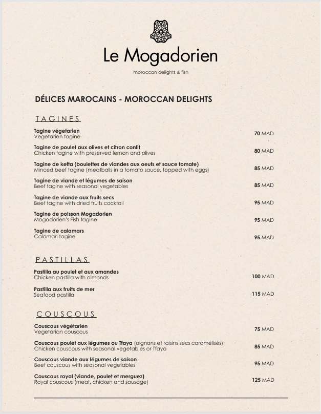 The menu at Restaurant le Mogadorien offers a balanced mix of traditional Moroccan flavors and Mediterranean influences, presented in a relaxed yet refined setting. Here, you’ll find a variety of dishes that suit both leisurely dinners and casual lunches, with a focus on fresh seafood, hearty tagines, and comforting pastillas.